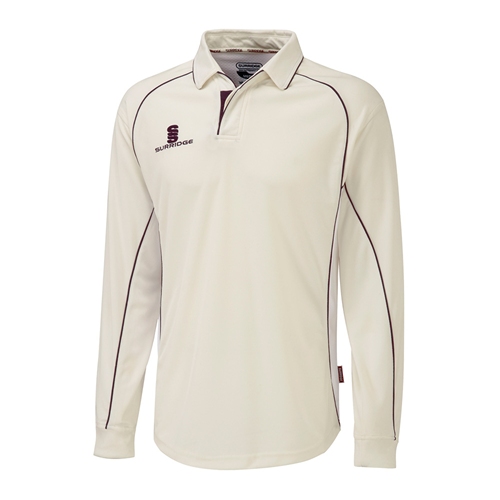Surridge Long Sleeve Cricket Shirt with maroon trim, embroidered with the Aigburth CC club badge.