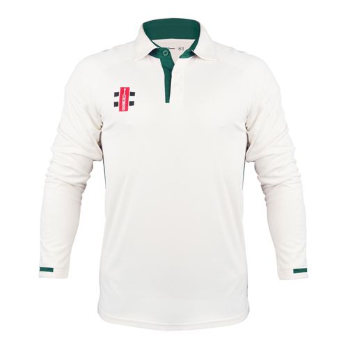 Gray Nicolls PRO Long Sleeve Cricket Shirt with green trim, embroidered with the Hartshorne CC club badge. Standard Fit