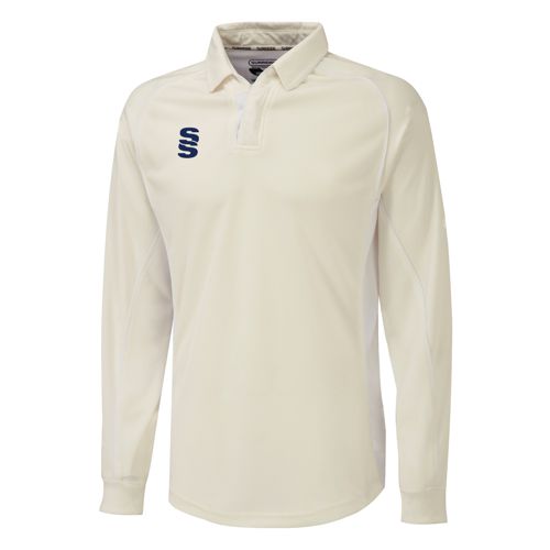 Surridge Long Sleeve Premier Cricket Shirt with navy trim, embroidered with the Melbourne Town CC club badge. Includes sponsor logo.
